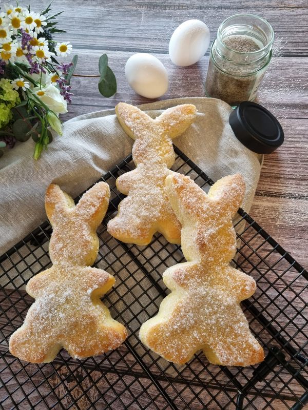 Die Häschen mit der Hälfte der geschmolzenen Butter bepinseln und 12-15 Minuten goldbraun backen. In der Zwischenzeit Zucker mit Black & White vermischen und auf eine Platte oder einen Teller geben. Die gebackenen Hasen mit Butter bestreichen und direkt in dem Zuckergemisch wenden. Danach auf einem Gitter auskühlen lassen und genießen.